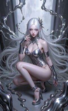 1girl, solo, long hair, breasts, looking at viewer, blue eyes, hair ornament, gloves, cleavage, bare shoulders, jewelry, medium breasts, very long hair, closed mouth, collarbone, full body, white hair, parted lips, hand up, fingerless gloves, high heels, leotard, lips, fingernails, parted bangs, eyelashes, strapless, makeup, thigh strap, watermark, black leotard, armlet, strapless leotard, long fingernails, stairs, realistic, nose, red lips, one knee, mascara,squat