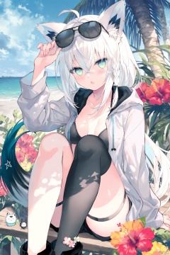(best quality), ((masterpiece)), (highres),original, extremely detailed, 1girl, solo, shirakami fubuki, virtual youtuber, animal ears, tail, long hair, fox tail, white hair, fox ears, green eyes, braid, sunglasses, sitting, ahoge, fox girl, looking at viewer, single thighhigh, eyewear on head, thighhighs, single braid, bangs, hair between eyes, outdoors, breasts, swimsuit, small breasts, open mouth, animal ear fluff, sidelocks, bikini, see-through, black thighhighs, hood, black footwear, ocean, black bikini, knees up, open clothes, tree, jewelry, hoodie, earrings, palm tree, adjusting eyewear, beach, flowers (innocent grey)