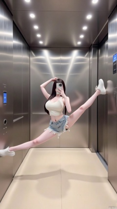 This is a high-resolution photograph taken inside an elevator with a polished, metallic finish. The subject is a young woman with fair skin, straight brown hair, and a slender physique. She is performing a dynamic, mid-air pose with one leg extended straight up and the other bent at the knee, creating a V-shape. She is wearing a white crop top that reveals her midriff and a pair of light blue denim shorts. Her footwear consists of white sneakers. She holds a smartphone in her right hand, which she appears to be using to take a selfie. The elevator's interior is sleek and modern, with a beige floor and walls, and a ceiling lined with recessed lighting. There are two large stainless steel elevator doors on either side, each equipped with a blue emergency button. The image captures a sense of playful defiance and creativity, with the woman's pose and the elevator's minimalist design complementing each other.