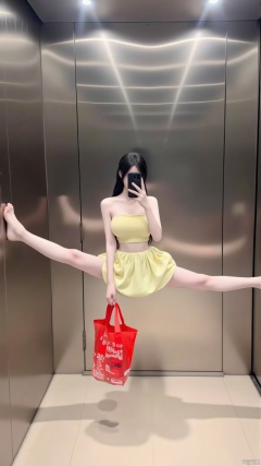Ponytail, doing cheating, Tez, image shows a young woman in the elevator. She was wearing a yellow strapless top and a yellow skirt. She has long black hair and holds a red shopping bag in her right hand. Her left leg was stretched in front of her and was taking selfies with her cell phone. The doors of the elevator are stainless steel and the floors are tiled.