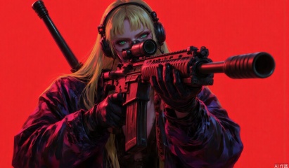 High Contrast, Black & Red, A girl shoots with an AWM sniper rifle, , full body, thick body, long blond hair, green eyes, (holding a weapon, holding a rifle, aiming, aiming, firing, shooting:1.4), gun, high heeled boots, (wide angle view:1.4) tactical headset, black silk gloves, alien planet, desert, tactical glasses