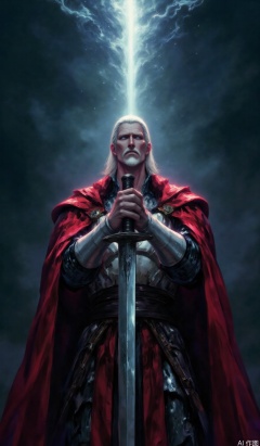 In a sweeping ultra-wide angle overhead view, a heroic figure stands poised for adventure against a backdrop of darkened night. The human hero, clad in gleaming white armor and a flowing red cloak, holds aloft a mighty sword as a beam of sacred light illuminates his upturned face from above. His features are sharply focused, bathed in the radiant glow, as if anointed by the heavens for his impending quest,TT,