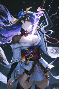 cowboy shot, 1girl, raiden shogun, holding sword,between breasts, head tilt, serious, hand up, looking at viewer, parted lips, wind, dark background, electricity, sparks,