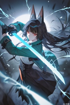 1girl, hoshimi miyabi, zenless zone zero, rei \(sanbonzakura\), torino aqua, (ciloranko:0.9), lack, from above, from side, foreshortening, animal ear fluff, black gloves, black hair, black necktie, black skirt, blunt bangs, closed mouth, fox ears, fox girl, green jacket, high-waist skirt, holding sword, glowing katana, energy, long hair, red eyes, serious, sidelocks, solo, white shirt,