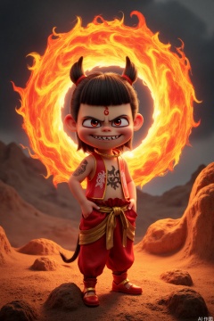 The demon child Nezha stood in the center of the flame vortex with his hands in his pockets, his smoky eyes were red, his fangs were smiling evilly, his muddy silk flowed like lava, the background was dark clouds and lightning, and the dark Chinese comic style,nezha