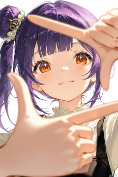 zhizi (Singularity age),1girl,solo,orange eyes,hair ornament,bangs,purple hair,long hair,smile,single_hair_bun,front view,bust,,Side ponytail,blunt bangs,,blouse,finger frame,