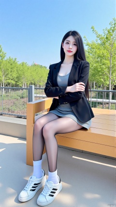 1girl,sky_lady,fengyao,1girl,The image is a photograph taken outdoors,possibly in a park or public area,with a clear blue sky and lush greenery in the background. The subject is a young Asian woman with long,straight black hair,fair skin,and a slender physique. She is seated on a wooden bench with a casual,relaxed pose,leaning slightly to her right with her arms crossed. Her attire includes a black blazer over a grey sweater and a short grey skirt,paired with sheer black pantyhose and white athletic shoes with black stripes. She wears white socks that reach mid-calf,adding a playful touch to her look. The background features a metal fence and trees,with a serene atmosphere. The overall style is casual and modern,with a focus on youthful fashion.,