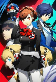persona, patterned background, looking at viewer, large breasts, action pose, aegis \(persona\), robot joints, yuuki makoto \(persona 3\), 2girls, 1boy, blonde hair, shiomi kotone, blue eyes, school uniform,, masterpiece, very awa, best quality, amazing quality, very aesthetic, absurdres, newest, intricate details