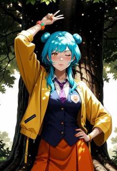 Smooth Quality, <lora:Avatar-Anime-Style2:1> In the Avatar Animation style, giant tree village,nail polish,blush,purple necktie,nijisanji,bracelet,yellow jacket,skirt,v,marinat0530,hand on own hip,virtual youtuber,one eye closed,hair bun,loose necktie,necktie,orange skirt,solo,umise yotsuha,arm up,blue vest,looking at viewer,orange eyes,highres,jacket,1girl,vest,striped necktie,double bun,blue hair,jewelry