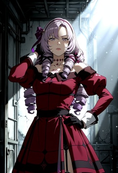 Smooth Quality, <lora:Avatar-Anime-Style2:1> In the Avatar Animation style, abandoned mine,black gloves,hair between eyes,hyakumantenbara salome,gloves,off-shoulder dress,hair ribbon,red dress,purple ribbon,purple bow,garter belt,bow,virtual youtuber,long hair,tattoo,parted bangs,1girl,black garter belt,looking at viewer,hand in own hair,simple background,puffy sleeves,solo,dress,white background,neck tattoo,juliet sleeves,nijisanji,ribbon,drill hair,hand on own hip,marinat0530,off shoulder,purple hair,long sleeves,highres