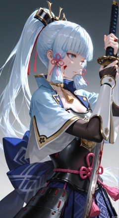 (visual captivating:1.2),(breathtaking visual depth:1.4),ultra-high resolution,32K UHD,sharp focus,best quality,masterpiece,Emotionalization,unconventional supreme masterpiece,masterful details,temperate atmosphere,high-end texture,in the style of fashion photography,(Visual impact:1.2),giving the poster a dynamic and striking appearance,(impactful picture:1.5),official art,colorful,movie perspective,amazing quality,very aesthetic,absurdres,extreme aesthetic,(wlop:0.6),honjou,raita,lack,rella,wanke,(artist:quasarcake:0.8),a shot with tension,.,1girl,solo,cute,simple_background,portrait,heterochromia, 1girl,solo,long hair,bangs,blue eyes,gloves,ribbon,holding,blue hair,hair ribbon,ponytail,weapon,sidelocks,japanese clothes,black gloves,sword,blunt bangs,holding weapon,armor,from side,blood,holding sword,katana,tassel,bridal gauntlets,tress ribbon,breastplate,blood on face,light blue hair,japanese armor,blood on clothes,arm guards,blood on weapon,kusazuri,kamisato ayaka,