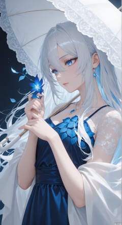(high quality, woman, elegant pretty face, female focus, solo) (white hair, Long hair), (one dark blue eye, one lighter blue eye, eyelashes), 1girl, beautiful eyes, detailed hair, detailed eyes, masterpiece, best quality, high resolution, 4k, perfect illustration, detailed art style,(rococo dress),full_body, pale, whiter skin, glow blue, cool tone, hair between eyes, (holding white parasol with blue leaves on bottom in hand), handfixer,