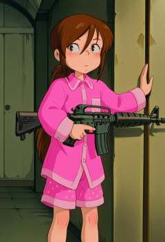 masterpiece, best quality, absurdres, anime screenshot, 1girl, solo, female focus, Carol_CTO, freckles, brown hair, asymmetrical bangs, long bangs, bangs between eyes, sidelocks, very long hair, ponytail, low ponytail, ponytail holder, CTO_def, pajamas, pink pajamas, polkadot print, collared shirt, button-up shirt, white buttons, sleeve cuffs, pajama shorts, pink shorts, c-m16, holding m16, against wall, standing, sneaking, looking to the side, indoors, bunker interior,