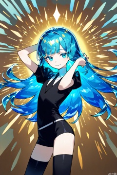 best quality, amazing quality, very aesthetic,1other,adjusting_hair,androgynous,artist_name,bangs,blue_eyes,blue_hair,blunt_bangs,character_name,colored_eyelashes,cowboy_shot,crystal_hair,diamond_(gemstone),eyebrows_visible_through_hair,gem,gem_uniform_(houseki_no_kuni),gold,long_hair,looking_at_viewer,necktie,smile,solo,sparkle,thighhighs