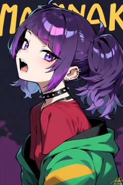 best quality, amazing quality, very aesthetic,1girl,solo,tanaka mamimi,spikes,open mouth,jacket,diagonal bangs,twintails,collar,purple hair,purple eyes,spiked collar,looking at viewer,green jacket,upper body,shirt,red shirt,signature,open clothes,choker,character name,open jacket,from side,spiked choker,blush,teeth,multicolored hair,short twintails,long hair