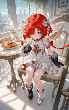 8k,best quality,masterpiece,(ultra-detailed),(high detailed skin),((artist:reoen),(artist:fuzichoco),(artist:atdan),(artist:torino_aqua),year 2024:0.8),[artist:wlop],[artist:ningen_mame],artist:ciloranko,[[artist:rhasta]],artist:tidsean,colorful,<lora:xl-ill-Tribios-v1-000012:0.8>,Trianne\(honkai:star rail\),1girl,blue eyes,red hair,solo,hair ornament,pointy ears,hair over one eye,flower,smile,hair flower,braid,short hair,dress,white dress,wings,gloves,black gloves,white flower,asymmetrical sleeves,asymmetrical clothes,long sleeves,asymmetrical footwear,mismatched footwear,black footwear,white footwear,boots,dining,