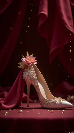 Background Atmosphere: Dark velvet drapery accentuates the pink embossed high heels' luxury, with a hazy, floating effect of pearl-like particles in the backdrop. Lighting: Dual softboxes at 45-degree side lighting combined with an overhead spotlight to sculpt the metallic relief details, with golden halos highlighting the heel curves. Artistic Style: Gregory Crewdson's dramatic composition blended with Annie Leibovitz's jewelry photography techniques. Gear: Canon EOS R5 with RF 100mm F2.8 Macro, settings at ISO100, f/8, 1/125s, tripod-mounted. Color Palette: Warm gold tones contrast with cool silver embossing, with amber gradients in the shadows. Special Effects: Macro depth-of-field blur, enhanced HDR texturing on relief patterns, and dynamic light flares intensifying metallic reflections.,plns_high heels