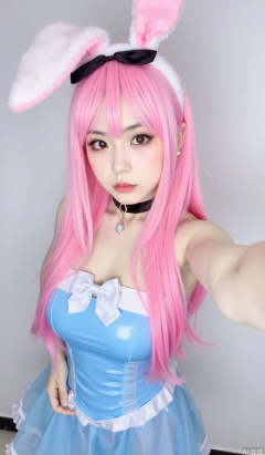 cosplay photo of a young woman with long pink hair and bunny ears, wearing a blue latex outfit with white frills, pale skin, high angle, black hairband, looking at the camera with a serious expression, bangs, bright eye makeup, medium close-up, from youtube, solo