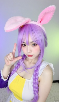 long purple braids, large pink ears, yellow white outfit, purple top, hand gesture