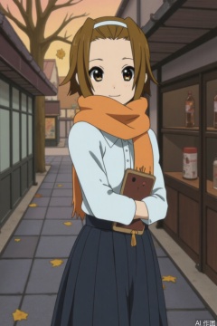 1girl, solo, brown hair, brown eyes, [moon white slanted collar seven-quarter sleeves + dark blue pleated long skirt] orange wool scarf with tassels, short hair with ears, pearl hairpin, nostalgic leather case with jazz drum parts, Shikumen alley with falling leaves, glass bottle soda frosting, dusk light and shadow pass through carved iron door, smile