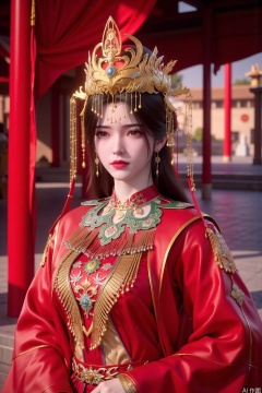 This is a beautiful picture showing a young woman dressed in a magnificent ancient costume. She was dressed in traditional red clothing, adorned with exquisite patterns and embroidery of gold and green, appearing very elegant and noble. She wears a golden headpiece on her head, with a complex design that exudes an extraordinary aura. Red curtains and classical architectural elements can be seen in the background, creating a solemn and elegant overall atmosphere.