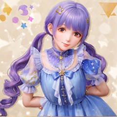 <lora:暖暖-缩小套a:0.7>,nikki,1girl,long hair,twintails,hair ornament,brown eyes,dress,purple hair,short sleeves,bangs,puffy sleeves,closed mouth,puffy short sleeves,lips,blue hair,jewelry,bracelet,see-through sleeves,blue dress,star (symbol),looking at viewer,upper body,purple_background,(bent over:1.2),(arms behind back:1.5),(head tilt:1.3),mellow jabot,solo,Round face,light smile,(Round chin:1.7),