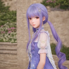 <lora:nikki:0.8>,nikki,1girl,twintails,long hair,jewelry,dress,blue hair,bracelet,hair ornament,brown eyes,short sleeves,purple hair,bangs,face to face,purple dress,(simple background:1.5),blurry background,gradient background,looking at viewer,arms behind back,(head tilt:1.3),indoors,looking back,