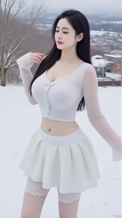 touxiong,A photo of a slim,fair skinned woman with long black straight hair. She was wearing a transparent ribbed white crop top,revealing her huge chest (transparent top:1.5),and a high waisted white pleated skirt with white lace stockings on top. Background snow scenery snow,full body view,