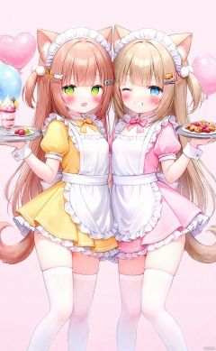 dim1_dim1-1e5ea48c,loli,loli,loli,loli,loli,loli,loli,loli, loradim1_loradim1-22f65b19, multiple_girls, 2girls, animal_ears, maid_headdress, tray, balloon, thighhighs, tail, cat_ears, green_eyes, holding_tray, smile, heart_balloon, one_eye_closed, dress, brown_hair, blush, pink_dress, apron, blue_eyes, maid, dog_ears, hair_ornament, cat_tail, looking_at_viewer, detached_sleeves, bone_hair_ornament, dog_girl, white_thighhighs, long_hair, frills, holding, yellow_dress, cat_girl, ribbon, parfait, fish_hair_ornament, open_mouth, pom_pom_hair_ornament, dog_tail, pink_ribbon, white_apron, frilled_apron, grin, breasts, maid_apron, puffy_sleeves, wrist_cuffs, hairclip, short_sleeves, frilled_dress, puffy_short_sleeves, food, waist_apron, ice_cream, sidelocks, cat_hair_ornament, feet_out_of_frame, animal_ear_fluff, blunt_bangs, one_side_up, standing, bow, small_breasts
