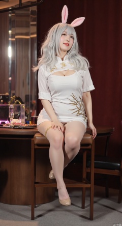 The golden leg ornaments hanging on the thighs.Golden leg ornaments.,The Chinese secretary Coser sat obliquely on a 2-meter-high stool in an extremely charming posture. Her legs overlapped, tilted slightly, and one hand gently placed on the edge of her legs. The tight tight oled luminous pantyhose lines looked more slender, straight and elastic in this sitting position, as if they contained endless youthful vitality and playfulness. Her body leaned forward slightly, and the little sexiness that was inadvertently revealed contrasted with the cute smile that was still hanging on her face. The rabbit ears trembled slightly with her movements, as if they were beaten for this cute and sexy picture. The pure cotton-textured tight succubus Feng Ougensha white china shirt was slightly wrinkled due to this sitting position, but it added a bit casual and innocent, showing an indescribable sexy and cute charm, as if it was a charming elf coming out of the two-dimensional world, attracting everyone's attention with its unique sitting position.look at view,Gold leg ring,gold pendant.gold pendant on legs,A pendant hanging from the legs.cosplay,Leg ornaments for cosplay.