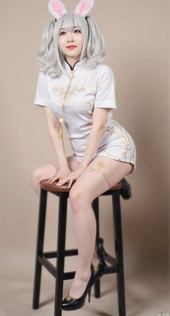 "Chinese secretary coser with white hair and rabbit ears, wearing tight OLED luminous pantyhose and a wrinkled white China shirt, sitting obliquely on a tall stool. **Golden thigh ornaments (highly detailed, prominent, pendant hanging)** and a gold leg ring. Cute smile, slightly sexy pose, two-dimensional elf charm, playful and youthful energy. (Emphasize: golden thigh ornaments, intricate details, shiny, eye-catching)."