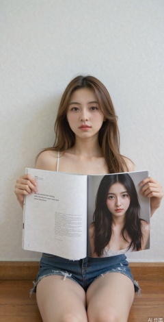 A woman Tangwei. with light brown hair and brown eyes is sitting on the floor, facing forward and looking directly at the viewer. Her hair is wavy and falls around her shoulders. She has light makeup on, including eyeshadow and lip color. She is wearing a light-colored top and denim shorts with frayed edges. She is holding a magazine open in front of her. The left page of the magazine has text that reads "Do you remember this feeling when time seems to stop certain places? And at the same time every starts to aroun". The right page of the magazine features a photograph of another woman with dark hair and brown eyes, looking slightly to the right. The background is a plain white wall with a wooden baseboard along the bottom. The lighting in the image is soft and natural.