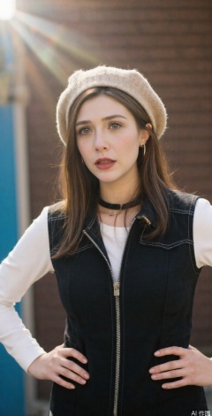 A woman with fair skin and brown hair is centered in the frame, wearing a beige beret on her head. Her brown hair is parted in the middle and falls down her shoulders. She has dark eyebrows, dark eyeliner, and red lipstick. She is wearing a black choker around her neck and gold hoop earrings. Her top has long white sleeves and a black sleeveless vest over it with a silver zipper down the front and white stitching details. Her hands are resting on her hips. The background is blurred, but hints of blue and brown suggest an outdoor setting. There are bright, hazy light flares throughout the image, particularly around the edges and above the woman's head.,ELIZABETH OLSEN