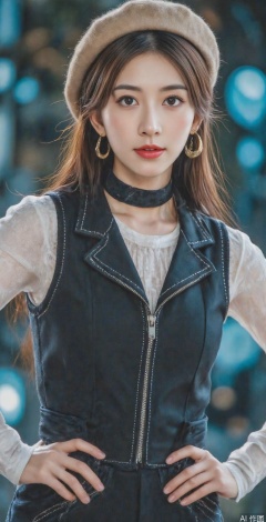 A woman with fair skin and brown hair is centered in the frame, wearing a beige beret on her head. Her brown hair is parted in the middle and falls down her shoulders. She has dark eyebrows, dark eyeliner, and red lipstick. She is wearing a black choker around her neck and gold hoop earrings. Her top has long white sleeves and a black sleeveless vest over it with a silver zipper down the front and white stitching details. Her hands are resting on her hips. The background is blurred, but hints of blue and brown suggest an outdoor setting. There are bright, hazy light flares throughout the image, particularly around the edges and above the woman's head.,linzhilin