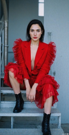 A stylish woman in a bold red avant-garde suit, sitting confidently on a modern staircase. The suit features layered tulle ruffles, adding a dramatic and fashion-forward touch. Her dark, tousled hair and minimal makeup enhance the effortlessly chic aesthetic. She wears sleek black boots, contrasting sharply with the red ensemble. The cool-toned, industrial setting provides a contemporary and edgy vibe. (large breast,large hips,supermodel body),Gal Gadot