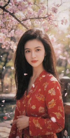 A stunning young Asian woman with long, flowing black hair and delicate features, wearing a traditional red kimono with golden embroidery. She stands gracefully beneath a canopy of blooming cherry blossoms, petals gently falling around her. The soft golden glow of the late afternoon sun filters through the branches, casting a dreamy ambiance. The background features a serene Japanese garden with a koi pond and a wooden bridge. Her expression is calm and poised, gazing into the distance. Shot with a medium close-up, cinematic depth of field, soft-focus background, and natural lighting.