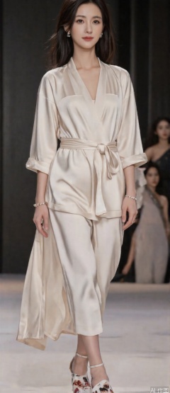An attractive young beauty, smile, tall and straight. She wore a white trimmed silk long bathrobe, tight silk belt, and white heels with red and black inkblot elements. She wore pearl earrings and bracelets. Fusion of cultural tradition and modern aesthetics, showing the unique charm of classical beauty and Eastern culture, beautiful, 36D full, runway, runway, lighting effects, Victoria's Secret temperament.,COSPLAY