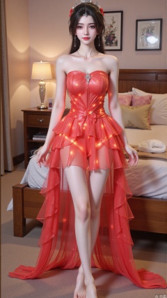 The image shows a young woman standing in a bedroom. She is wearing a red lingerie set with a strapless top and a ruffled skirt. The top has a sweetheart neckline and is covered in small white lights. The skirt is made up of multiple layers of ruffles, creating a layered effect. The woman has long dark hair styled in loose waves and is wearing red lipstick. She has a red flower in her hair and is posing with one hand on her hip. The background of the image shows the bedroom with a bed, nightstands, and a lamp.