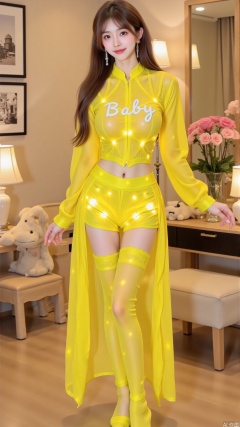 The image shows a young woman standing in a luxurious bedroom. She is wearing a bright yellow outfit with the word "Baby" written in white letters across the chest. The outfit consists of a long-sleeved top with a high neckline and a pair of matching shorts with thigh-high stockings. The woman is also wearing high heels and has long brown hair styled in loose waves. The room is decorated with a vase of pink flowers, a lamp, and other decorative items. The floor is made of wood and there is a large mirror on the wall.