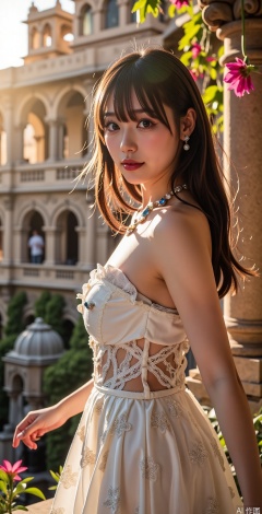 A ravishing apsara, adorned in a resplendent crystal bra that refracts and reflects the warm sunlight into a kaleidoscope of colors, stands majestically on the sun-kissed terrace of an intricately designed Indian castle, its stone walls weathered to a soft golden brown and covered in vibrant flowering plants with delicate petals in shades of crimson, amber, and emerald green that cascade down like a lush tapestry. The soft, diffused light, infused with the warmth of the setting sun, dances across her porcelain skin, accentuating every curve and nuance, from the subtle contours of her face to the gentle sway of her hips, while the shallow depth of field blurs the lush foliage into a warm, golden haze that seems to vibrate with an otherworldly energy. Her captivating gaze, filled with playful allure and a hint of mischief, locks onto the viewer as she exudes an air of confidence and charm, her piercing sapphire eyes sparkling like gemstones in the fading light, drawing the viewer in with an irresistible allure that seems to transcend time and space. As she stands poised on the edge of the terrace, the wind whispers through her hair, rustling the delicate strands into a soft, ethereal dance that adds a sense of dynamic movement to the scene, while the castle's facade, with its intricate carvings and ornate details, stretches out behind her like a richly textured backdrop, inviting the viewer to explore its secrets. The camera captures her in exquisite detail, from the delicate petals of the flowers to the intricate carvings on the castle's facade, as if frozen in time, a true masterpiece of high-definition, hyperrealistic art that seems to pulse with a deep emotional resonance, as if the apsara's very essence has been distilled into this single, perfect moment. With a subtle lens flare that adds a touch of warmth and depth to the image, and a hint of fashionable elegance that infuses the scene with a sense of sophisticated glamour, the overall effect is one of breathtaking beauty and captivating allure, a true work of art that seems to transport the viewer to a world of enchantment and wonder.,CROSS-LACED MINI DRESS,HARUKA,COSPLAY
