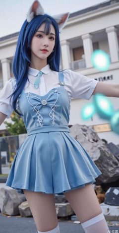 Smooth Quality, anime screencap, anime style, studio anime, 1girl, long hair, fox girl, blue hair, green eyes, white fluff in ears, fluffy tail, medium breasts, blouse, short sleeves, pleated skirt, thigh high socks, glowing eyes, aura, (telekenesis), outstretched arms, floating building, floating debris, floating rocks, ruins, post-apocalypse,COSPLAY,CROSS-LACED MINI DRESS,HARUKA