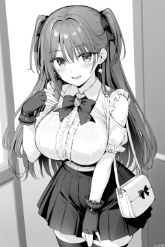 1girl solo long hair breasts looking at viewer blush smile bangs skirt shirt thighhighs gloves bow bare shoulders twintails jewelry monochrome greyscale pleated skirt frills fingerless gloves bag huge shoulder cutout