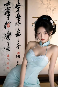 1girl,looking at viewer,black hair, hair ornament, dress,kanji