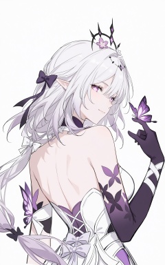 <lora:xl-ill-castorice(honkai_star rail)_v1-000010:0.8>,castorice\(honkai:star rail\),1girl,bug,butterfly,solo,long hair,dress,gloves,white dress,bow,purple gloves,purple butterfly,smile,pointy ears,hair bow,butterfly on hand,looking at viewer,white bow,very long hair,bare shoulders,looking back,purple eyes,pink eyes,white hair,closed mouth,hair between eyes,hair ornament,elbow gloves,breasts,flower,tiara,blush,from behind,strapless,<lora:illustrious_Simple Flat Coloring_v2-000028:0.75>,Simple Flat Coloring,sketch,line,simple background,white background,