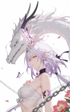 professional,masterpiece,best quality,newest,absurdres,highres,high resolution,best quality,ultra-detailed,high-definition,4k,8k,sharp focus,clear,crisp edges,smooth,vibrant colors,dynamic range,depth of field,safe,8k,best quality,masterpiece,(ultra-detailed),(high detailed skin),((artist:reoen),(artist:fuzichoco),(artist:atdan),(artist:torino_aqua),year 2024:0.8),[artist:wlop],[artist:ningen_mame],artist:ciloranko,[[artist:rhasta]],artist:tidsean,colorful,Agm,<lora:xl-ill-castorice(honkai_star rail)_v1-000010:0.8>,castorice\(honkai:star rail\),1girl,bug,breasts,butterfly,long hair,earrings,chain,jewelry,from side,flower,pointy ears,solo,medium breasts,bandages,dragon,sarashi,white hair,glowing butterfly,upper body,glowing,profile,purple hair,very long hair,blush,multicolored hair,petals,bare shoulders,parted lips,<lora:illustrious_Simple Flat Coloring_v2-000028:0.75>,Simple Flat Coloring,sketch,line,simple background,white background,
