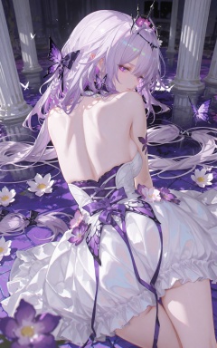 professional,masterpiece,best quality,newest,absurdres,highres,high resolution,best quality,ultra-detailed,high-definition,4k,8k,sharp focus,clear,crisp edges,smooth,vibrant colors,dynamic range,depth of field,safe,8k,best quality,masterpiece,(ultra-detailed),(high detailed skin),((artist:reoen),(artist:fuzichoco),(artist:atdan),(artist:torino_aqua),year 2024:0.8),[artist:wlop],[artist:ningen_mame],artist:ciloranko,[[artist:rhasta]],artist:tidsean,colorful,Agm,<lora:xl-ill-castorice(honkai_star rail)_v1-000010:0.8>,castorice\(honkai:star rail\),1girl,dress,solo,long hair,purple theme,purple hair,flower,purple eyes,looking at viewer,very long hair,looking back,multicolored hair,white dress,tiara,bare shoulders,bow,braid,from behind,back,hair ornament,bug,butterfly,bare back,strapless dress,white flower,purple flower,backless dress,backless outfit,purple bow,purple dress,strapless,back bow,crown,<lora:xl-ill-Detail enhancement-v1:0.8>,Detail enhancement,<lora:748cmSDXL:0.8>,748cmstyle,