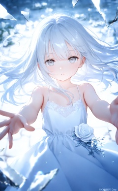 masterpiece,best quality,high quality,loli,chromatic_aberration,//,1girl,solo,long hair,dress,looking at viewer,white eyes,glass,white dress,grey eyes,white hair,flower,broken glass,white theme,dress flower,blue theme,bare shoulders,glass shards,white flower,reaching,reaching towards viewer,water,parted lips,closed mouth,sleeveless,reflection,sleeveless dress,white rose,watermark,expressionless,//,year_2023,year_2024,//,official art,depth of field,detailed light,blurry background,cinematic lighting,ray tracing,ultra detailed,god rays,backlighting,photo background,film grain,chromatic aberration,volumetric lighting,depth of field,blurry background,shiny skin,floating hair,cinematic lighting,day,very aesthetic,