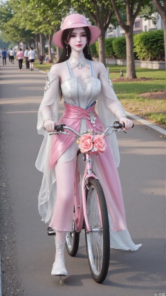 Pink sweet girl on a bicycle, sweet melody floating in the wind 🚴♀️💖With the sunshine pouring on her body and the breeze gently brushing her cheeks, the pink sweet girl riding a bicycle is the most touching scenery of this summer day. Let's follow her and feel this lightness and sweetness together. 🌸 Pink cycling girl style: a pink sun hat, protecting the delicate skin, while highlighting the vitality of youth. A flowing pink dress, dancing with the wind, like a princess in a fairy tale. A pink bicycle, her partner in exploring the world and an extension of her sweet image. 🍦 Sweet Summer Time: Riding a bicycle through the boulevard, enjoying the coolness and tranquility of summer. Stop occasionally and taste an ice cream, let the sweetness melt in your mouth and your heart soften. Ride with friends, share the laughter and surprises on the road, and let this sweetness become a common memory. 📸: a picture of a girl riding a pink bicycle, wearing a pink sun hat and a flowing dress, with a tree-lined path,.(all body)