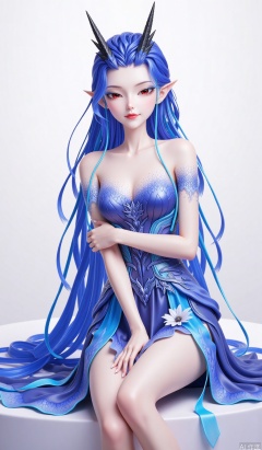 score_9, score_8_up, score_7_up,highly detailed digital,CG,1girl, solo, long hair, breasts, red eyes, dress, cleavage, bare shoulders, medium breasts, sitting, blue hair, flower, horns, pointy ears