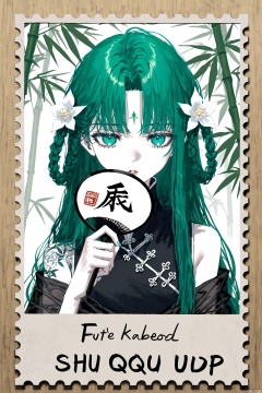 1 girl, hair ornament, green hair, upper body, long hair, sleeveless, dress, bare shoulders, holding a fan, hand fan, looking at the audience, hair ring, braid, white flower, black dress, facial mark, sleeveless dress, separate bangs, braided hair ring, Chinese clothes, jewelry, tattoo, forehead mark, bamboo, shut up, microblog logo, eyelashes, green eyes, folds, separated lips, black sleeves, shawl, separated sleeves,
